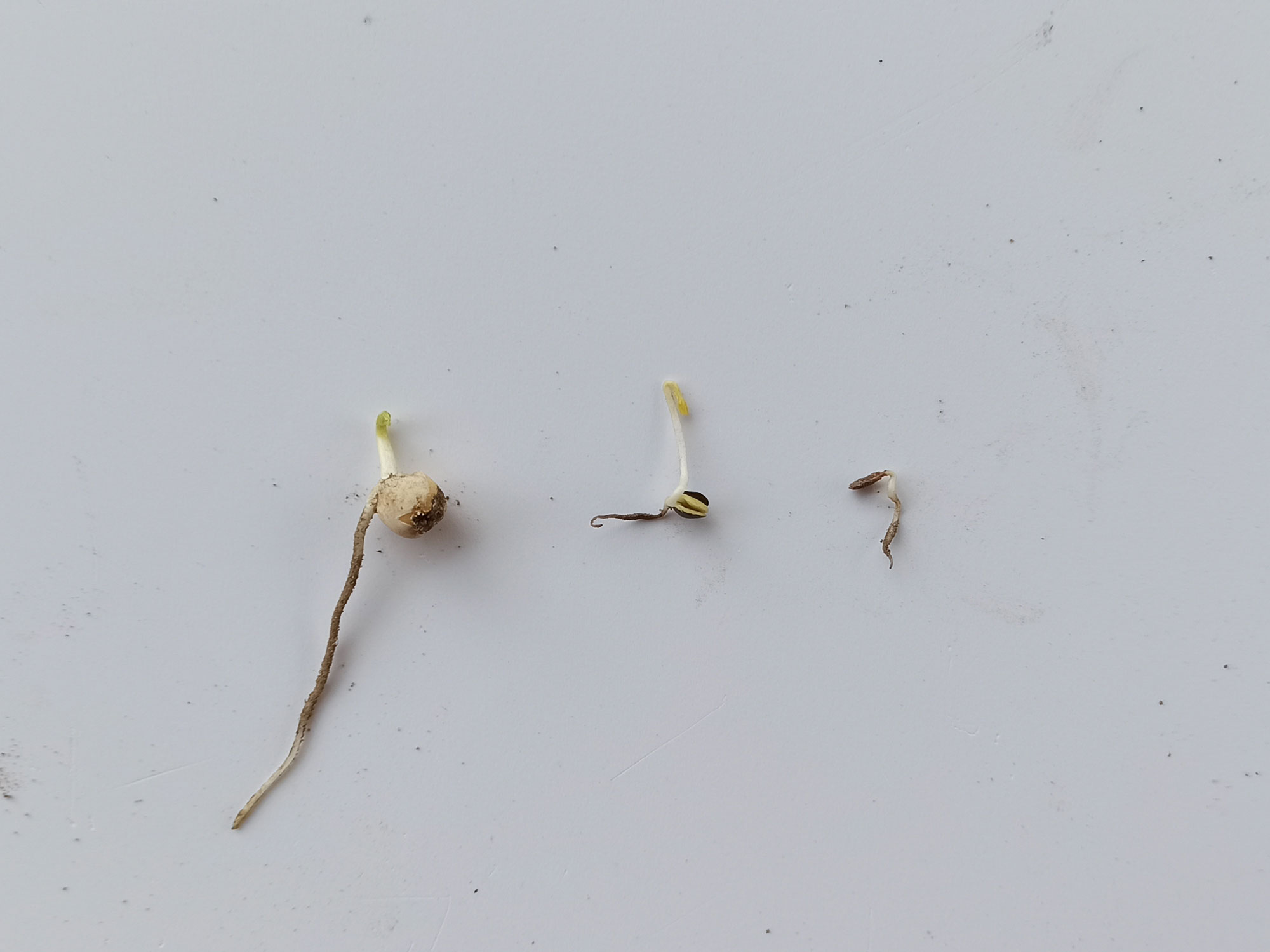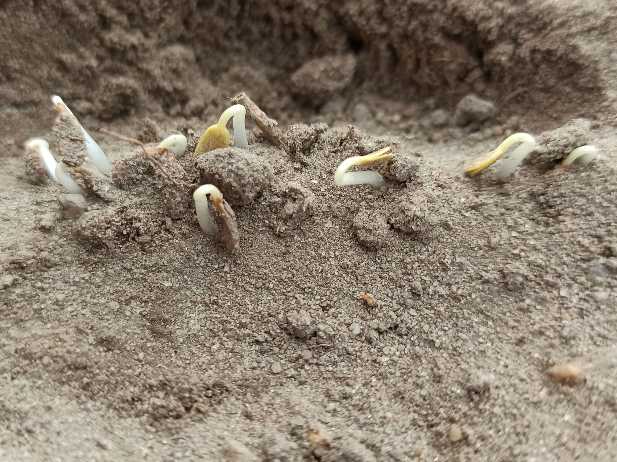 Fünf Tage nach der Aussaat von Lein, Erbse und Linse lassen sich die ersten Keimlinge finden. Allerdings muss man dafür noch die erste Erdschicht vorsichtig beiseite schieben.