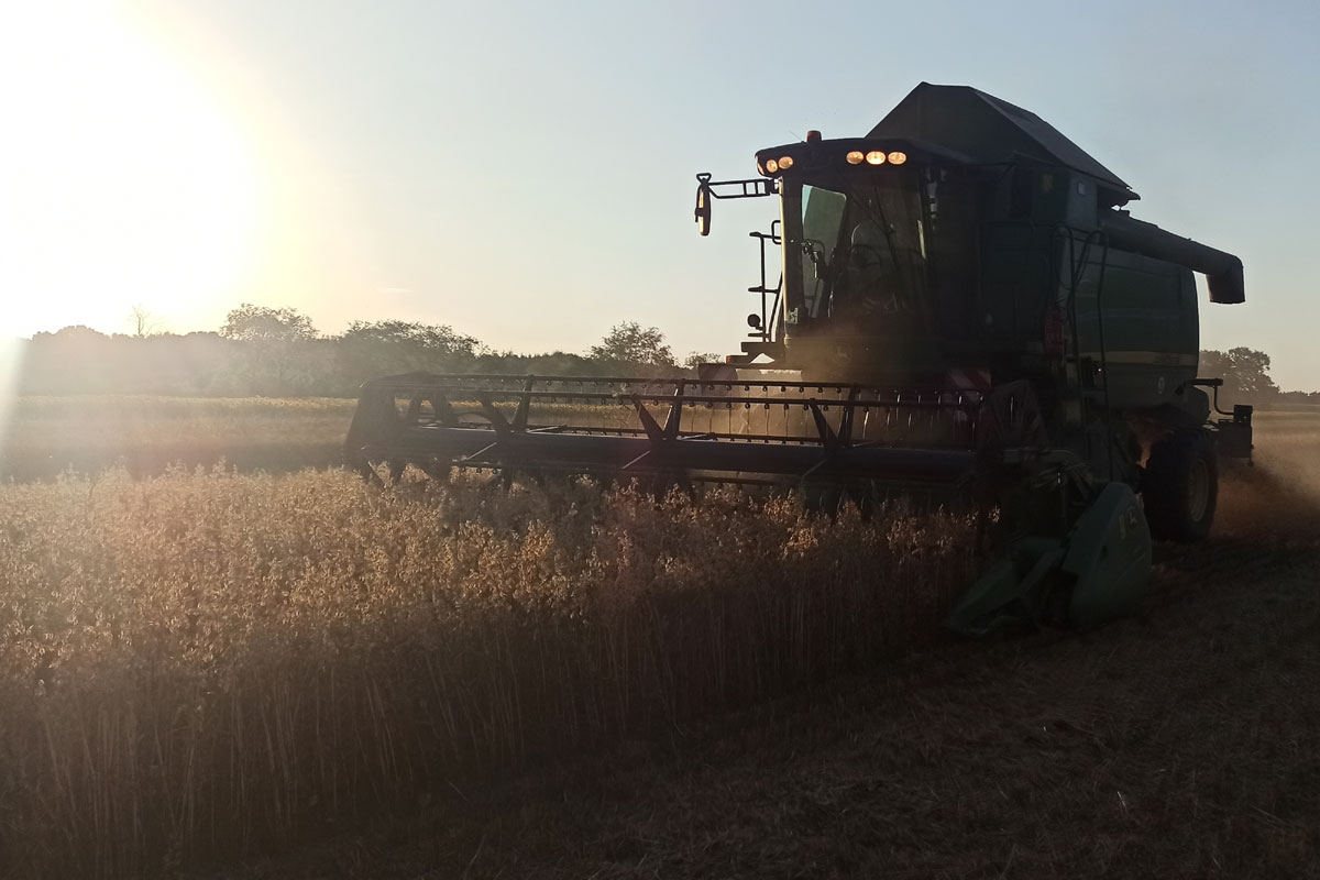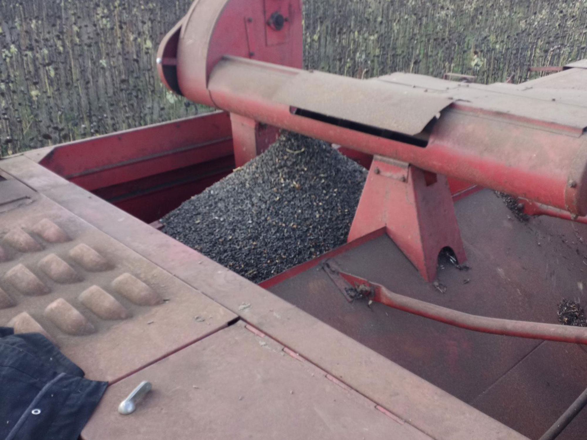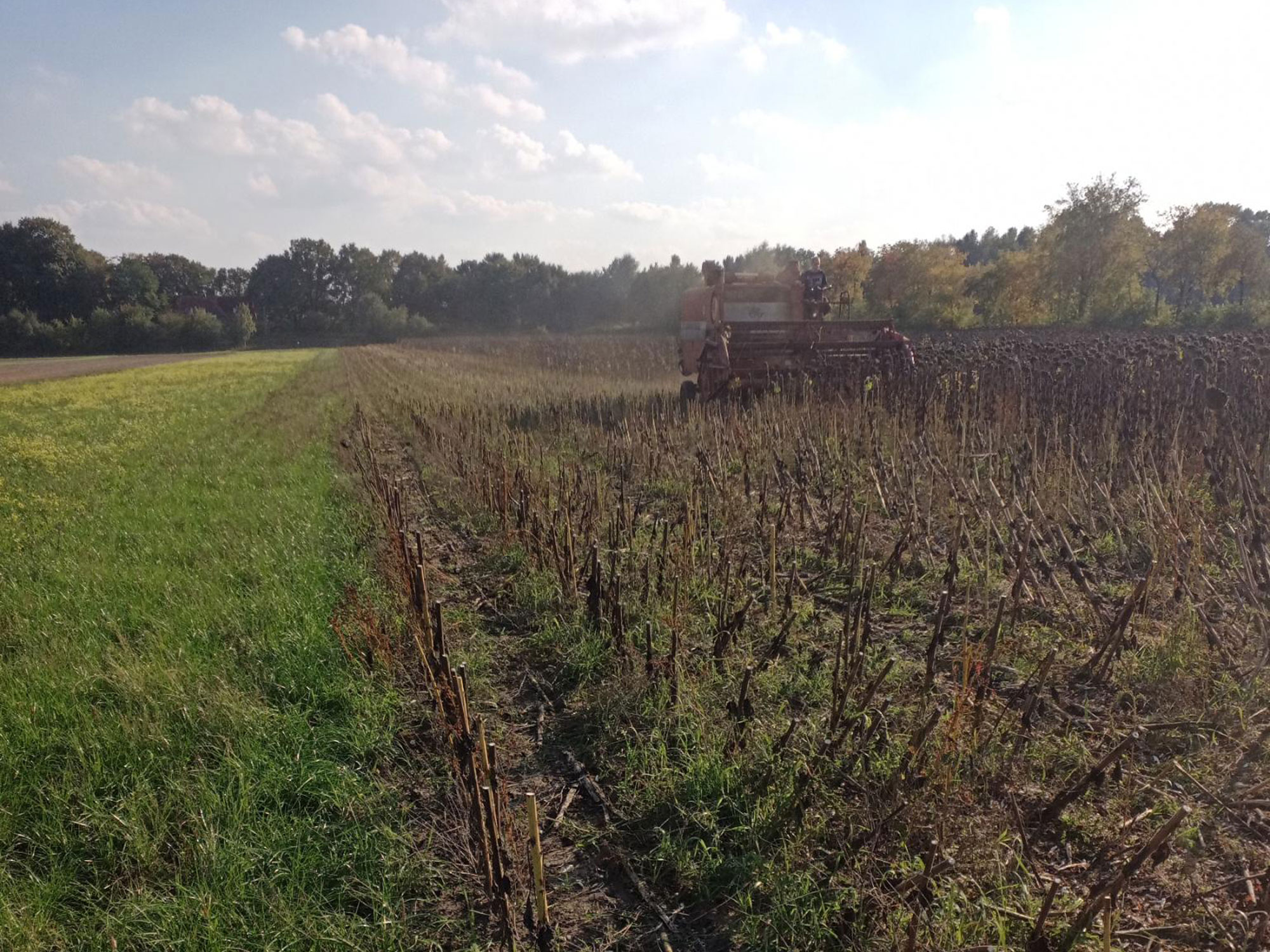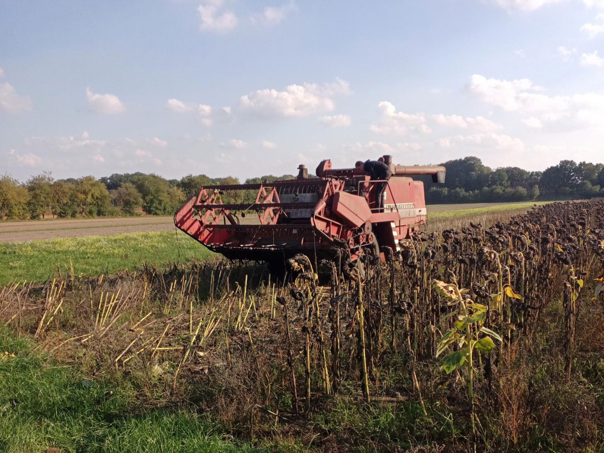 Am 30. September ist mit der Sonnenblume die letzte Sonderkultur auf dem Modell-Acker geerntet. Rund 4 Tonnen Sonnenblumenkerne haben wir mit unserem alten Drescher von den 1,9 ha großen Schlag herunter geholt.