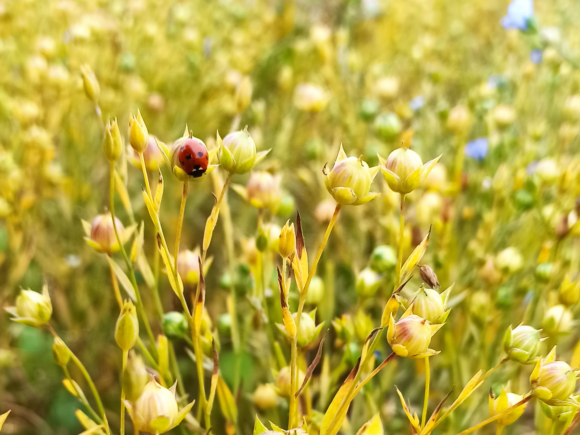 Öllein-Flächen sind eine wahre Augenweide. Besonders schön ist die leider sehr kurze Blüte. Doch auch die kugeligen Kapseln an der Spitze des Halmes sind für viele Besucherinnen und Besucher sehr ästhetisch. Störend ist nicht nur deswegen der hohe Unkrautdruckt. Trotz guter Wetterbedingungen für die Unkrautregulierung haben wir dieses Thema nicht ideal bearbeitet. Für das kommende Jahr sind andere Striegelzeiten und zusätzliche Durchgänge mit der Hacke unser Vorhaben. Zudem soll eine Untersaat zum Einsatz kommen.